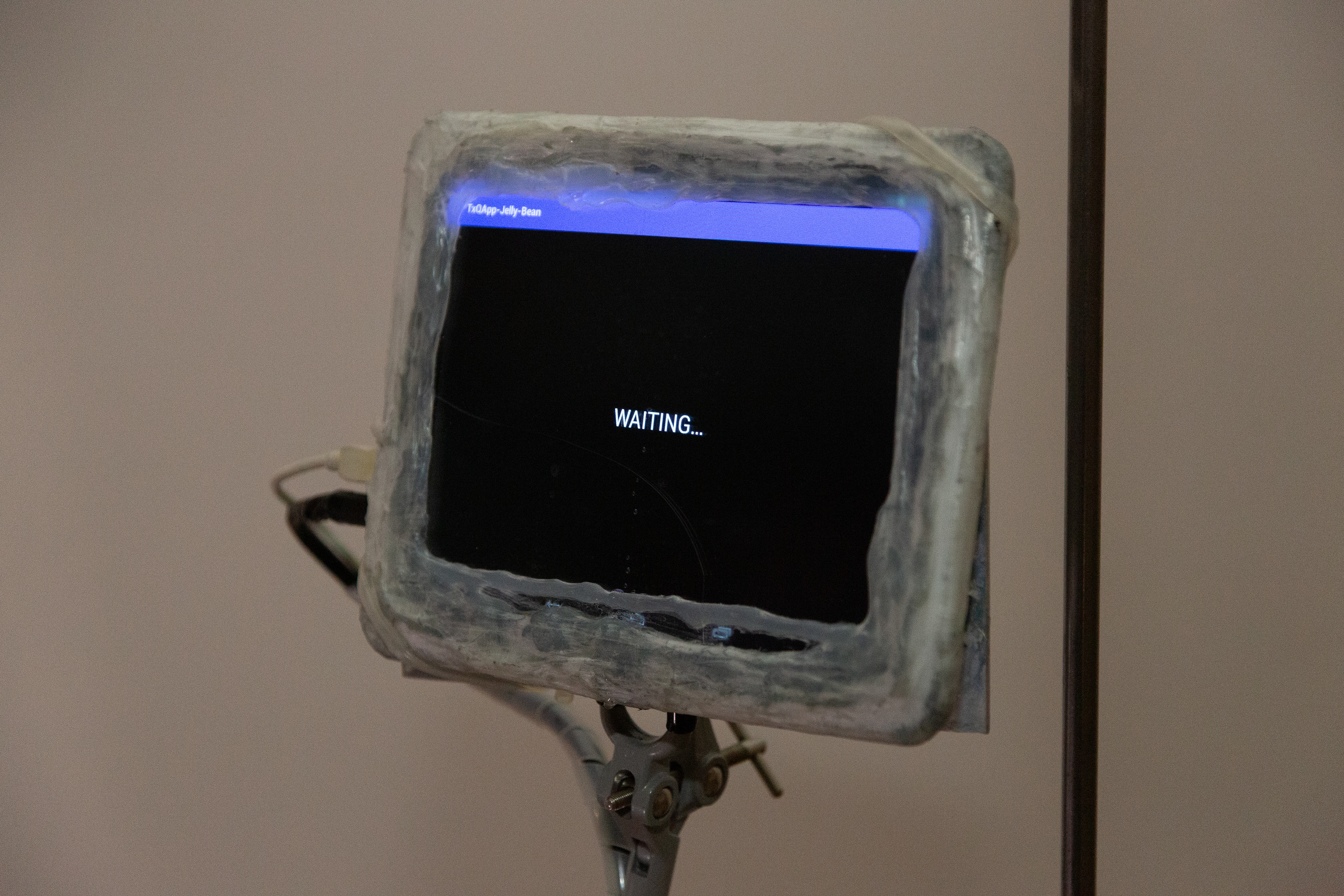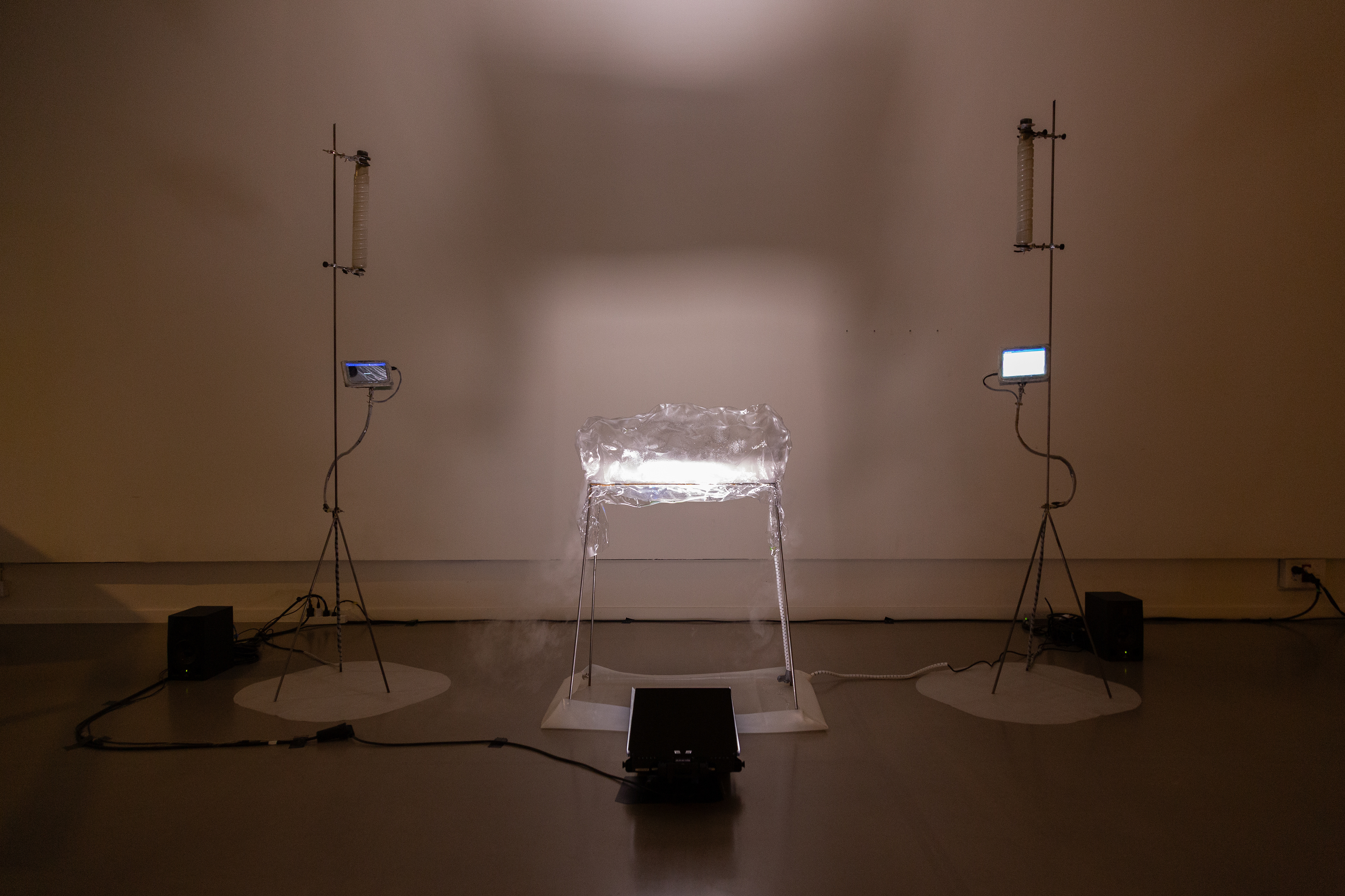 Two embedded mobile devices running TxQapp, enabling bidirectional audiovisual communication activated by extreme weather, in line with contemporary explorations of technological mediation and glitch aesthetics (Menkman, 2011), reflecting the entanglement of material and atmospheric agencies (Parikka, 2015). A cultural-technological dialogue connecting Basque pagan folklore, quantum physics, and climate prediction systems.